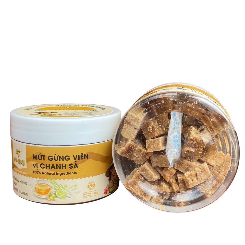 Mứt gừng viên vị chanh sả là sự kết hợp độc đáo giữa gừng sẻ núi ấm nồng và chanh muối chua – mặn thanh nhẹ, hương thơm sả tạo nên viên mứt thơm ngon, dễ ăn và tốt cho sức khỏe. Sản phẩm được chế biến hoàn toàn từ nguyên liệu tự nhiên, không phẩm màu, không chất bảo quản – an toàn cho cả gia đình. Sản xuất theo tiêu chuẩn ISO 22000:2018.