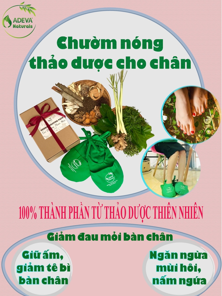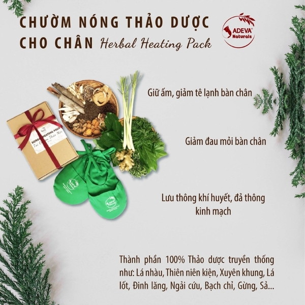 – Thành phần Túi chườm thảo dược ADEVA được nghiên cứu và tạo ra từ 100% thảo mộc tự nhiên truyền thống được sử dụng từ lâu đời như: Quyết minh tử, Lá Nhàu, Ngải cứu, gừng, nghệ, xuyên khung, Sả, Vỏ bưởi… giúp đả thông kinh mạch, giải trừ đau mỏi, thư giãn tinh thần.